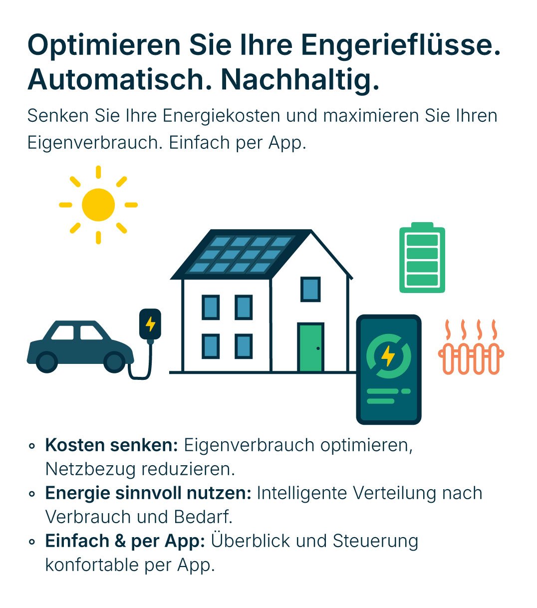 Steuern Sie Ihren Eigenverbrauch. Senken Sie Ihre Stromkosten. Optimieren Sie Ihre Energieflüsse – vollautomatisch und komfortabel per App.